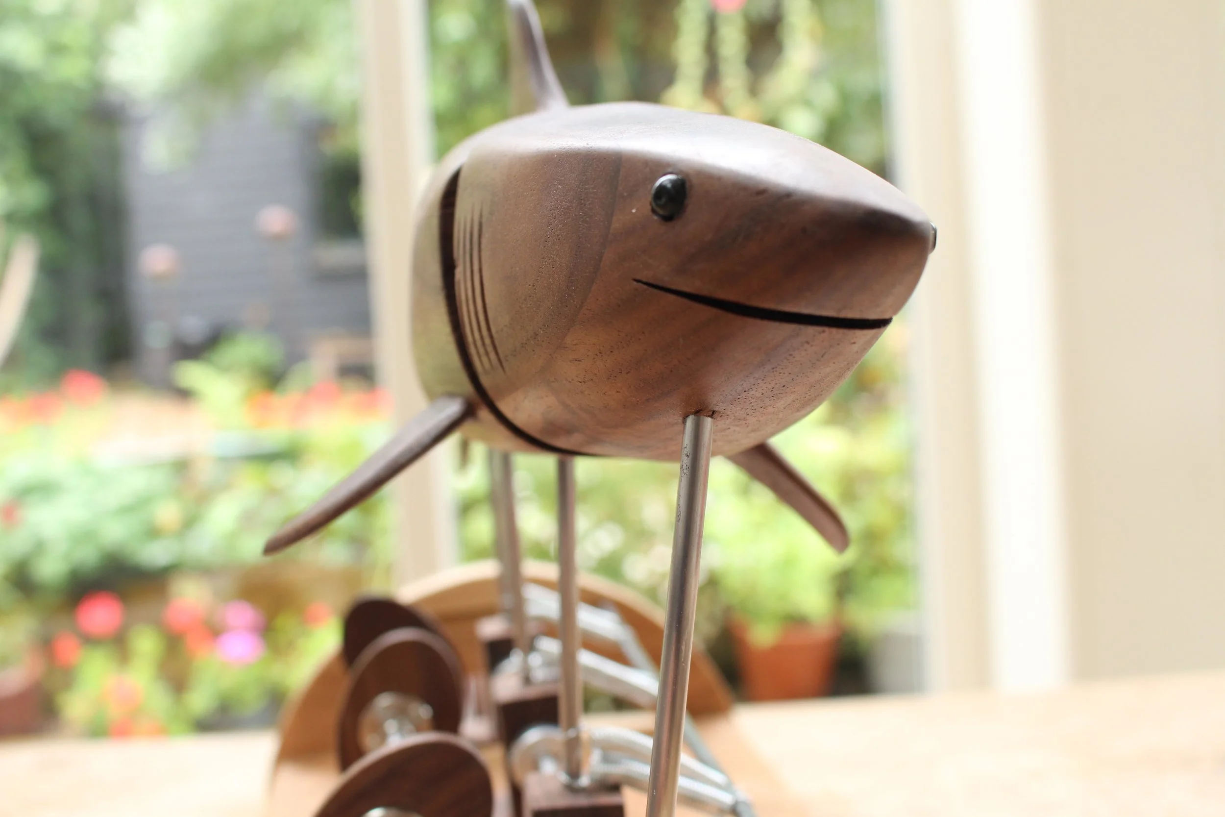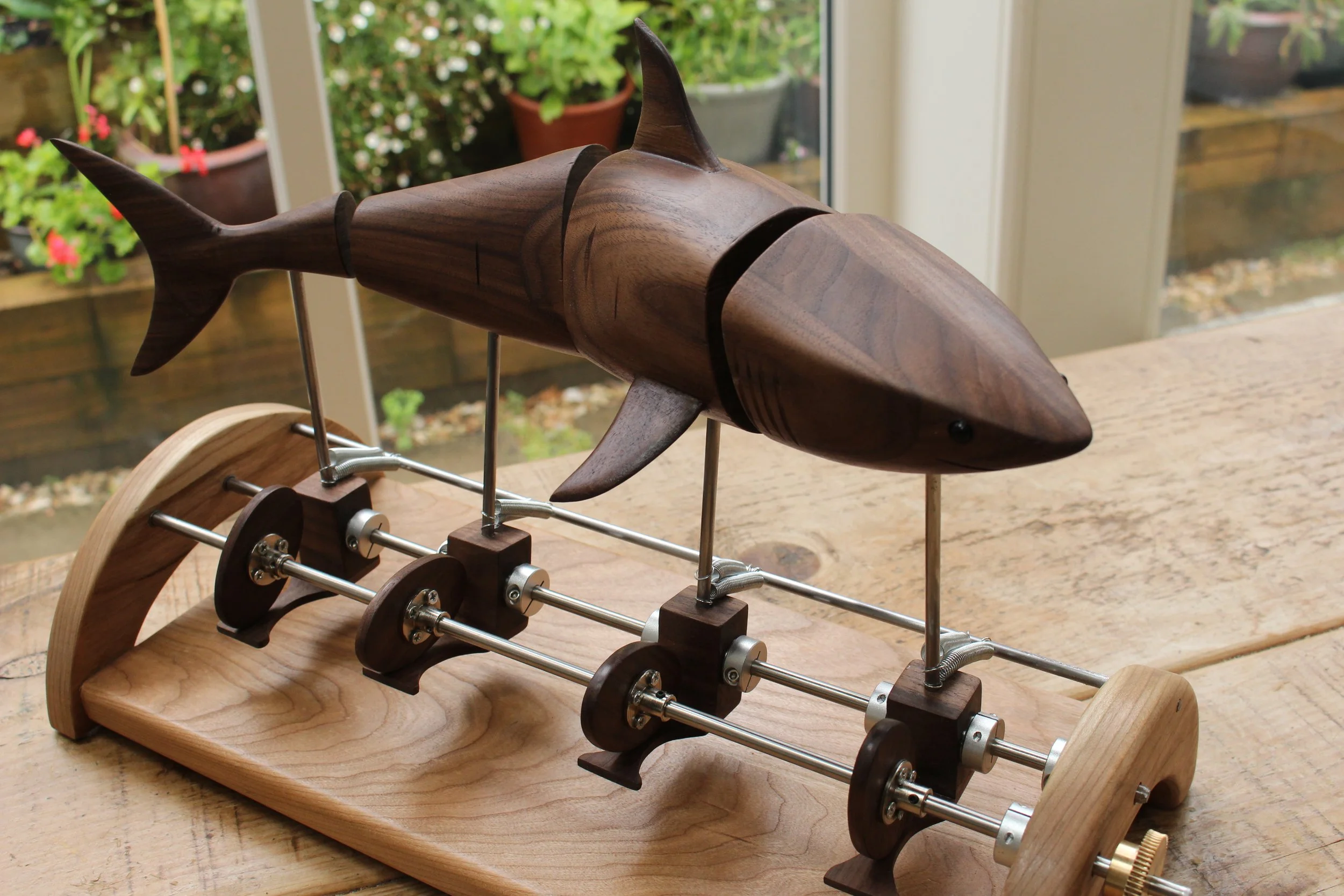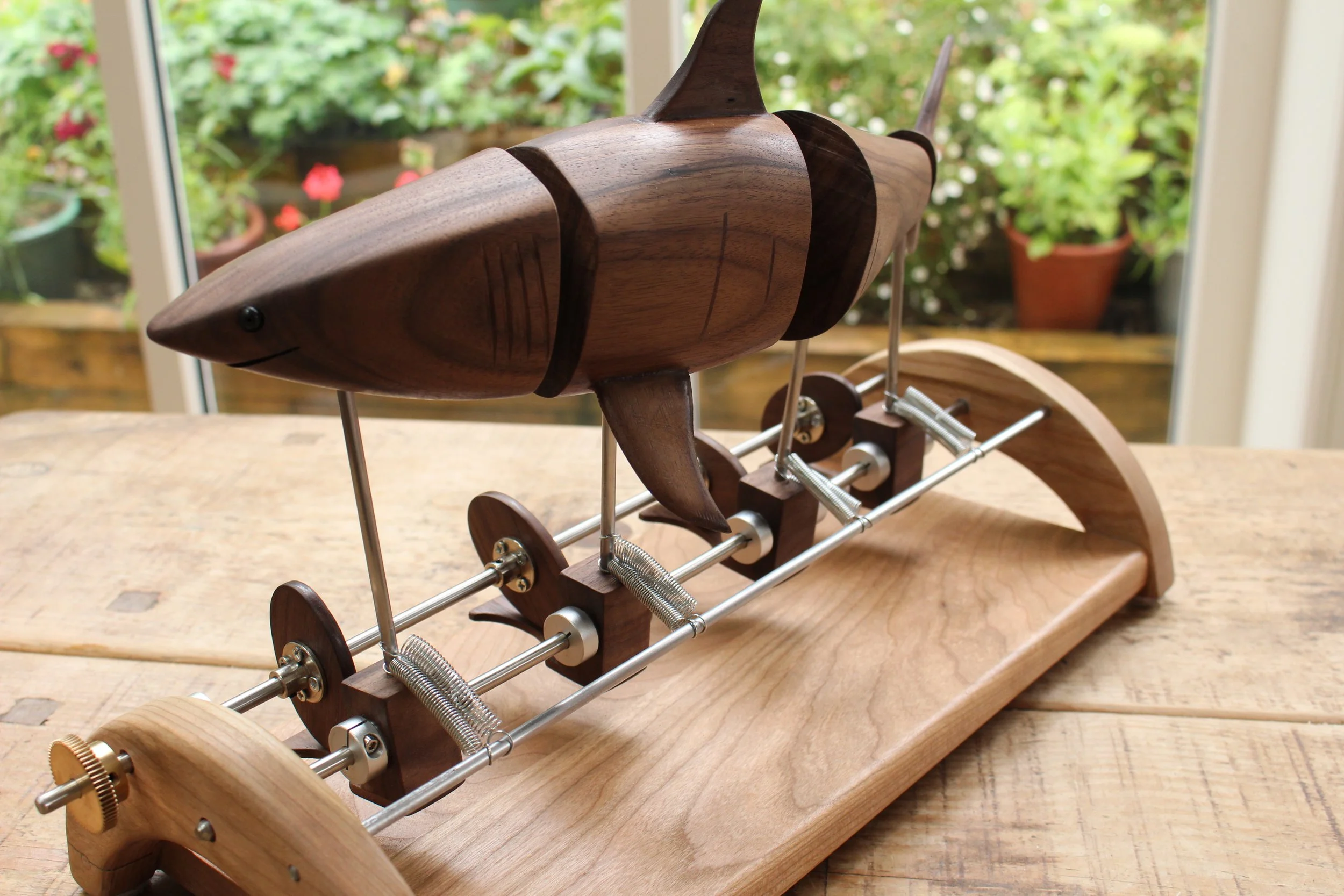 Created with walnut on a cherry base; the mechanism is driven by 4 wooden cams on stainless steel axles and is hand cranked. The shark is originally carved as a single work before being spilt into 4 sections as you see here.